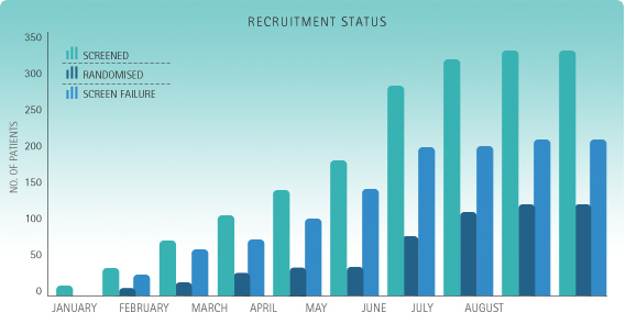 - Adding two countries in CEE resulted in higher than expected recruitment, beating timelines and accommodating a higher patient number due to higher than expected screening failures.